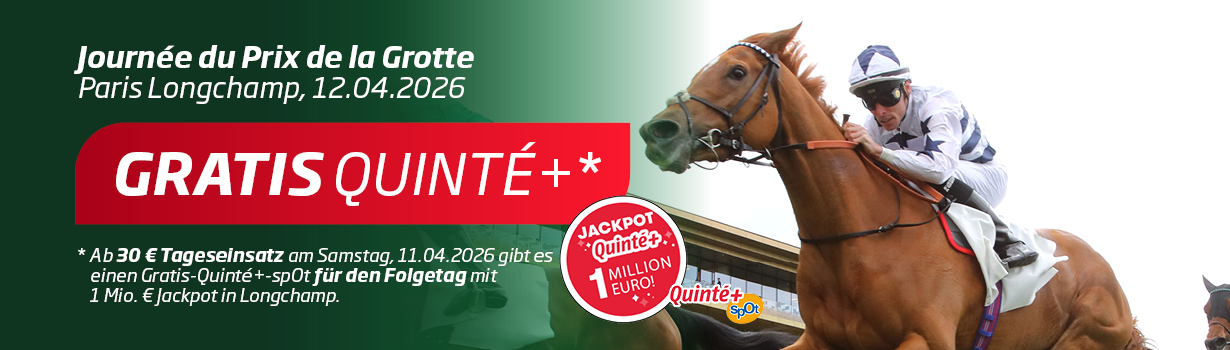 Am Samstag, 11. April 2026 gibt es ab 30 € Tageseinsatz auf französische Rennen einen gratis Quinté+ spOt für den Folgetag.