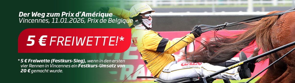 Auf dem Weg zum Prix d'Amérique erwartet Sie anlässlich des 6. Qualifikationsrennens, dem Prix de Belgique, am Sonntag 11. Januar 2026 in Vincennes eine Freiwette in Höhe von 5,- Euro für eine Festkurs-Siegwette ab 20 Euro Festkurs-Wetteinsatz in den ersten 4 Rennen in Vincennes.