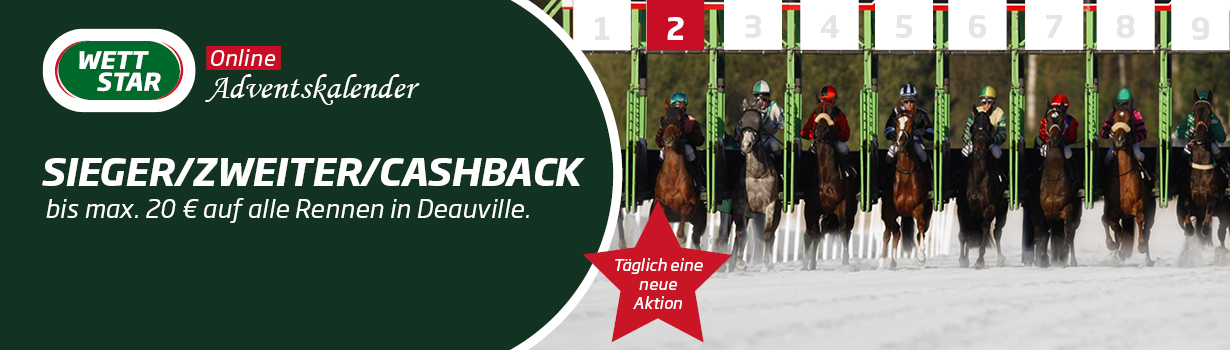Am 2. Tag des großen WETTSTAR Online-Adventskalenders 2025 erwartet Sie die Aktion Siegwette-Zweiter- bis zu 20 € Cashback auf alle Rennen am Dienstag, 2. Dezember 2025 in Deauville.