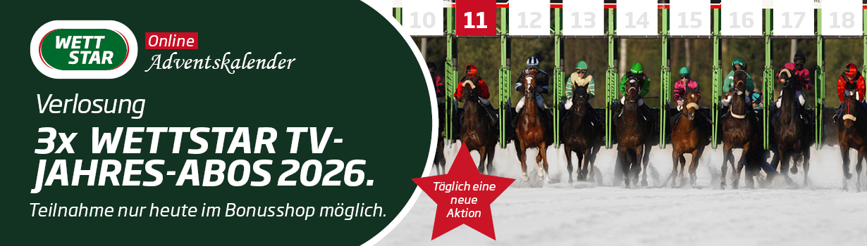 Am 11. Dezember erwartet Sie im großen WETTSTAR Online-Adventskalenders 2025 die Verlosung von 3 WETTSTAR-TV-Jahres Abos für die Saison 2026.