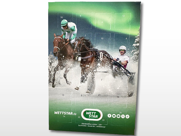 Unser WETTSTAR Adventskalender mit leckerer Vollmilchschokolade "Fairtrade". Der praktische Tischkalender im Hochformat mit Rückenaufsteller verschönert die Adventszeit. Die klassischen 24 Türchen versüßen Ihnen die Tage bis Weihnachten.