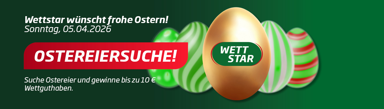 Anlässlich des Osterwochenendes verstecken wir am Sonntag, 5. April 2026 Ostereier auf unserer wettstar-pferdewetten.de! Finden Sie ein Ei und sichern Sie sich bis zu 10 Euro Bonus.