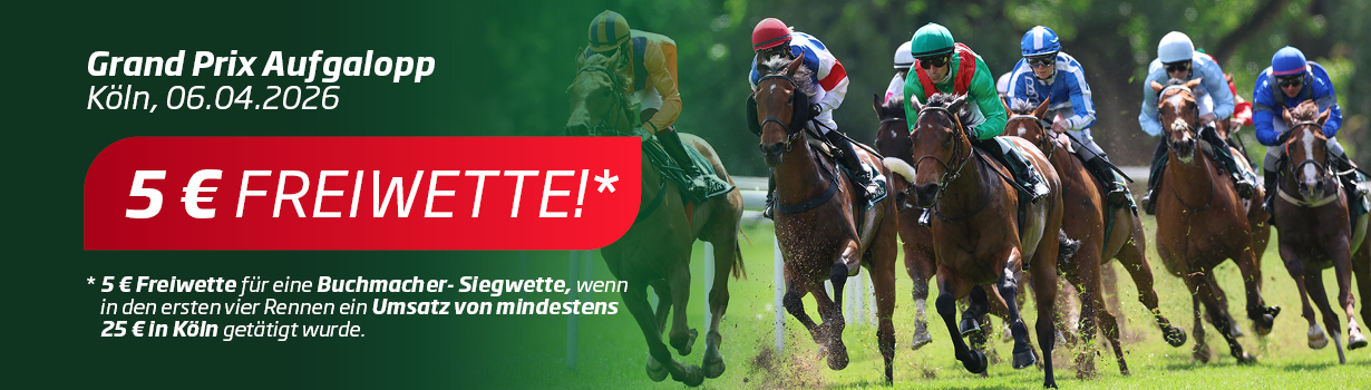 Zum diesjährigen Ostermontags-Renntag am 6. April 2026 in Köln erwartet Sie eine Freiwette in Höhe von 5,- Euro für eine Buchmacher-Siegwette (Win_BM) ab 25 Euro Wetteinsatz (Totalisator- und Buchmacherwetten) in den ersten 4 Rennen in Köln.
