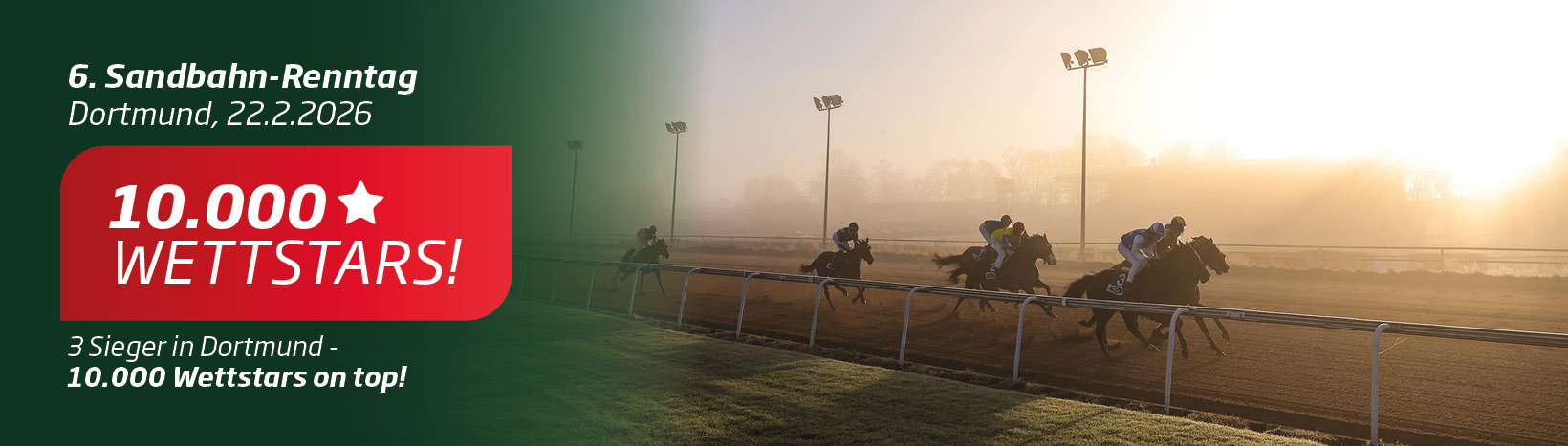 Heute belohnen wir jeden Kunden mit zusätzlichen 10.000 Wettstars für Sieger in 3 verschiedenen Rennen in Dortmund.