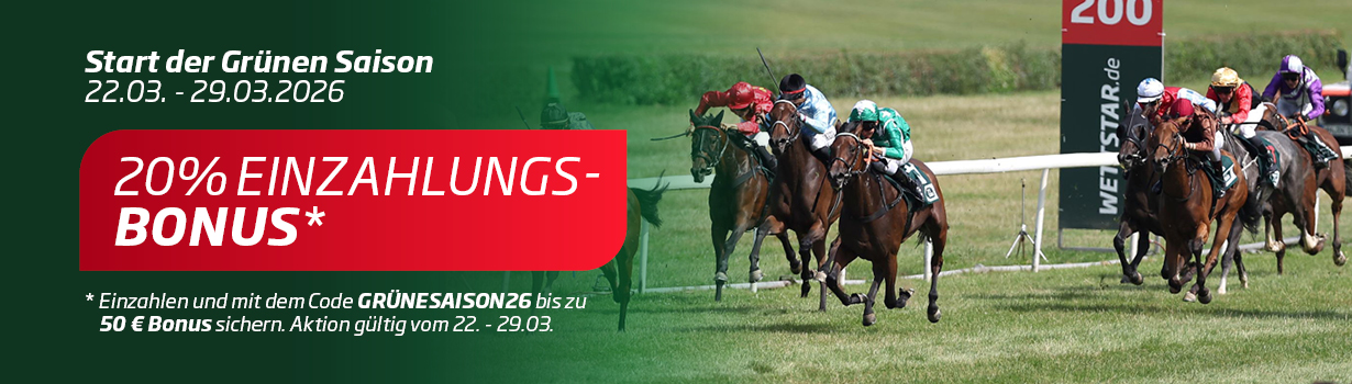 Wettstar gewährt seinen Kunden z.B. im Rahmen von Gewinn- oder Tippspielen, in Form von Gutscheinen oder auf Einzahlungen bzw. Wetten innerhalb eines festgelegten Zeitraums bzw. auf bestimmte Rennen, einen Bonus, der für Wetteinsätze bei Wettstar genutzt werden kann. Für alle Werbeaktionen, Gutscheine und Boni gelten, wenn nicht bei der jeweiligen Aktion andere Vereinbarungen getroffen werden, unsere allgemeinen Bonusbedingungen.