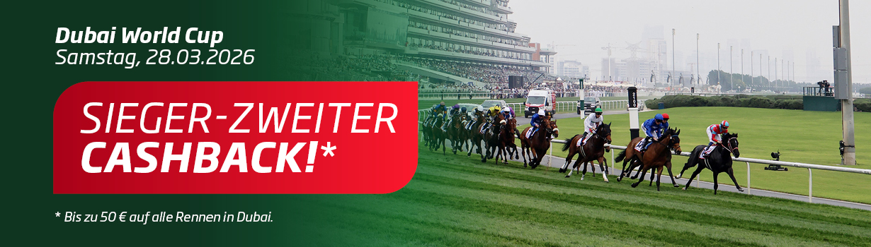 Am Samstag, 28. März 2026 erwartet Sie zum Dubai World Cup die Aktion Siegwette - Zweiter bis zu 50 € Cashback auf alle Rennen in Meydan.