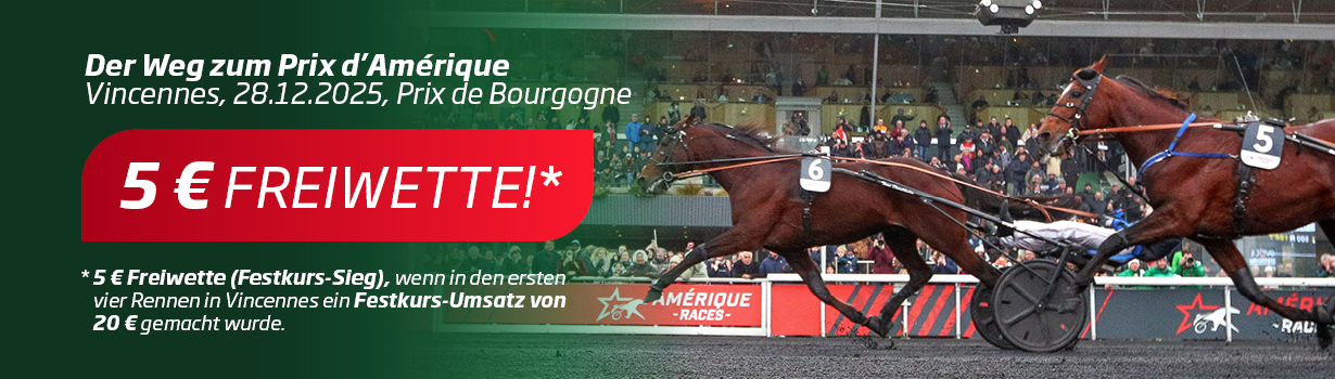 Auf dem Weg zum Prix d'Amérique erwartet Sie anlässlich des 5. Qualifikationsrennens, dem Prix de Bourgogne, am Sonntag 28. Dezember 2025 in Vincennes eine Freiwette in Höhe von 5,- Euro für eine Festkurs-Siegwette ab 20 Euro Festkurs-Wetteinsatz in den ersten 4 Rennen in Vincennes.