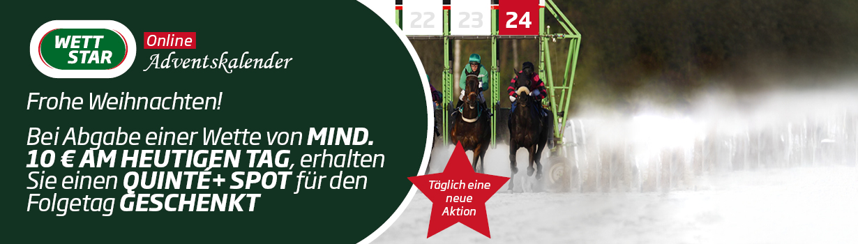 Frohe Weihnachten wünscht WETTSTAR - Heute gibt es im großen WETTSTAR Online-Adventskalender 2025 einen Quinté+ spOt für den Folgetag geschenkt, wenn Sie bei der heutigen Wettabgabe mind. 10 € einsetzen!