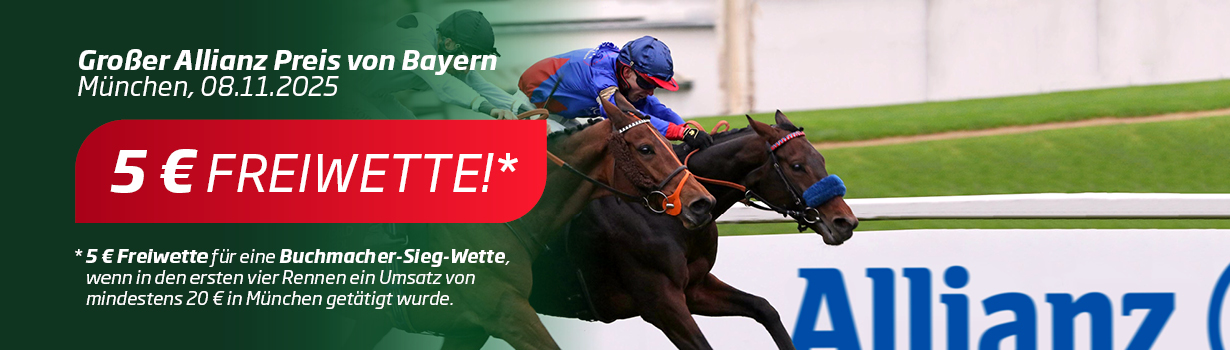 Zum diesjährigen Grosser Allianz Preis von Bayern-Renntag am Samstag, 8. November 2025 in München-Riem erwartet Sie eine Freiwette in Höhe von 5,- Euro für eine Buchmacher-Siegwette (Win_BM) ab 20 Euro Wetteinsatz in den ersten 4 Rennen München-Riem.