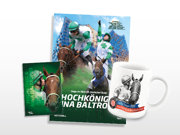 Sie möchten das Komplettpaket (limitierte Auflage) des Derbysiegers 2025 Hochkönig und Nina Baltromei haben? Dann sichern Sie sich jetzt mit 12.000 Wettstars Ihr Paket.
