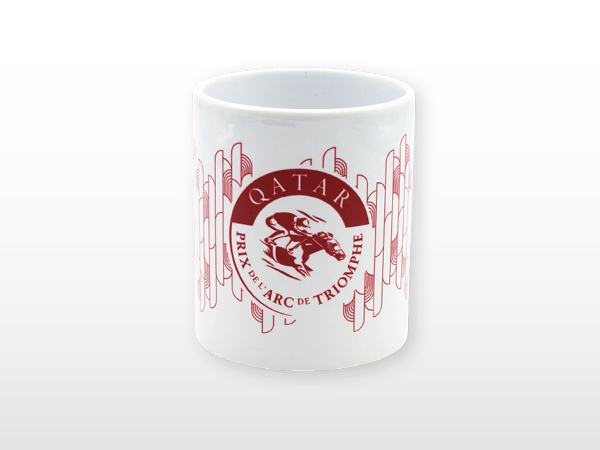 Weißer Becher mit dem Motiv „Qatar Prix de l'Arc de Triomphe” und dem ikonischen Logo. Eine perfekte Ergänzung Ihrer Sammlung, um Ihre Lieblingsgetränke stilvoll zu genießen.