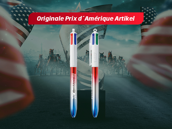 Der offizielle BIC 4-Farben -Kugelschreiber , Prix d'Amérique Legend Race Edition , besticht durch sein dreifarbiges Metallic-Design in Blau, Weiß und Rot.