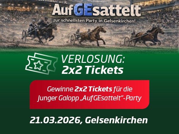 Zu gewinnen gibt es 2 x 2 Tickets für die Junger Galopp "AufGEsattelt"-Party am 21. März 2026 im GelsenTrabPark.